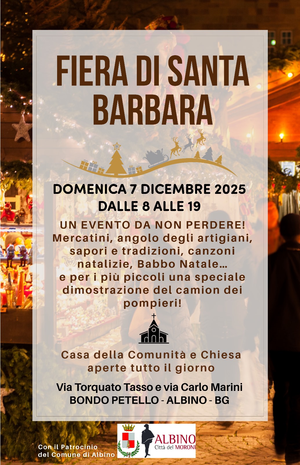 Domenica 7 dicembre, dalle ore 08.00 alle ore 19.00 presso via Torquato Tasso e via Carlo Marini a Bondo Petello di Albino, è in programma la fiera di Santa Barbara.