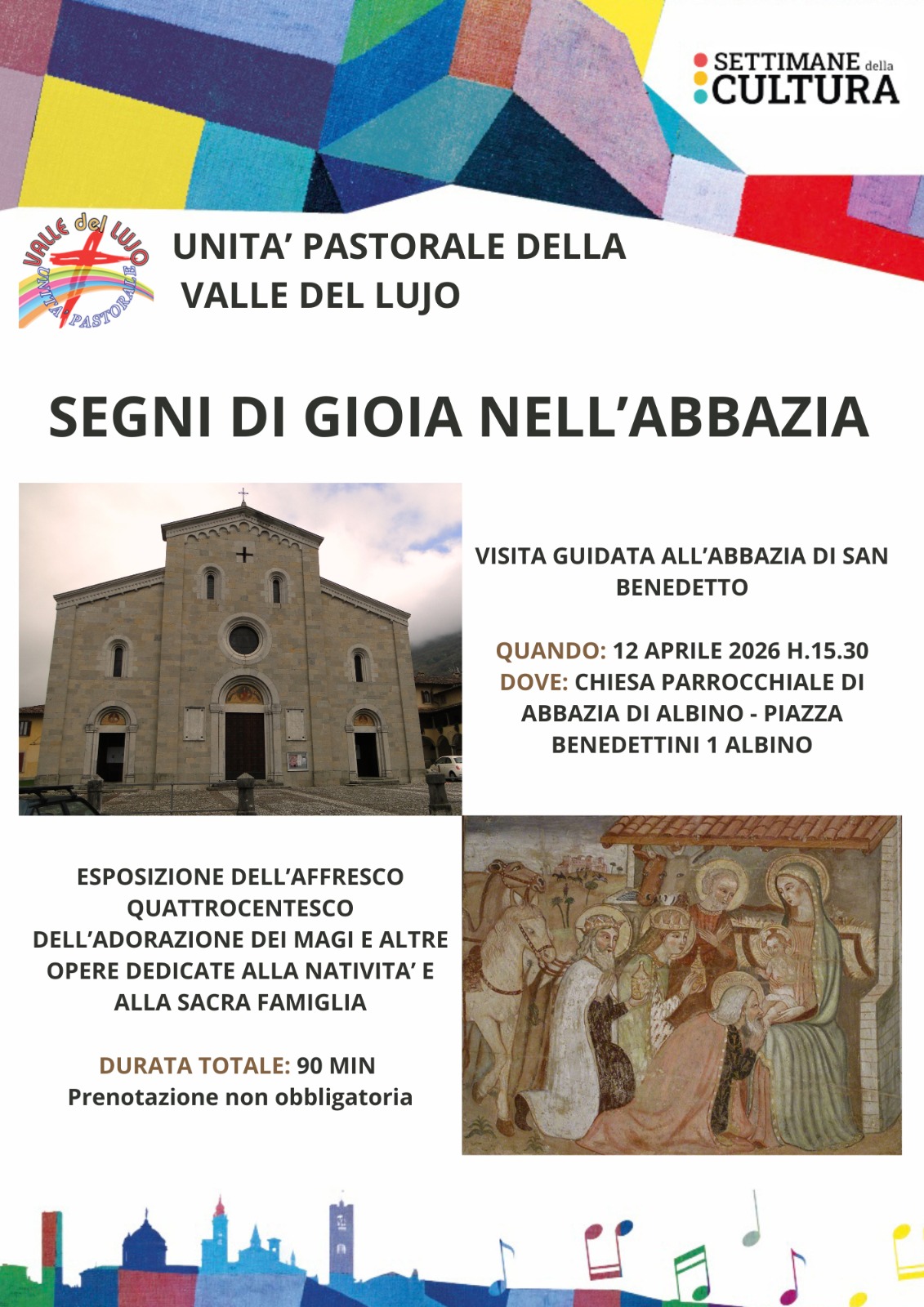 Domenica 12 aprile 2026, dalle ore 15.30 alle ore 17.00, si terrà una visita guidata all’Abbazia di San Benedetto, nella frazione di Abbazia, in Valle del Lujo ad Albino.